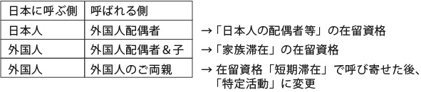 外国人が外国からご家族(外国人配偶者&子)を呼び寄せる場合は、在留資格「家族滞在」が必要となります。日本人が外国人配偶者を呼び寄せる場合は、「日本人の配偶者等」の在留資格が必要です。
